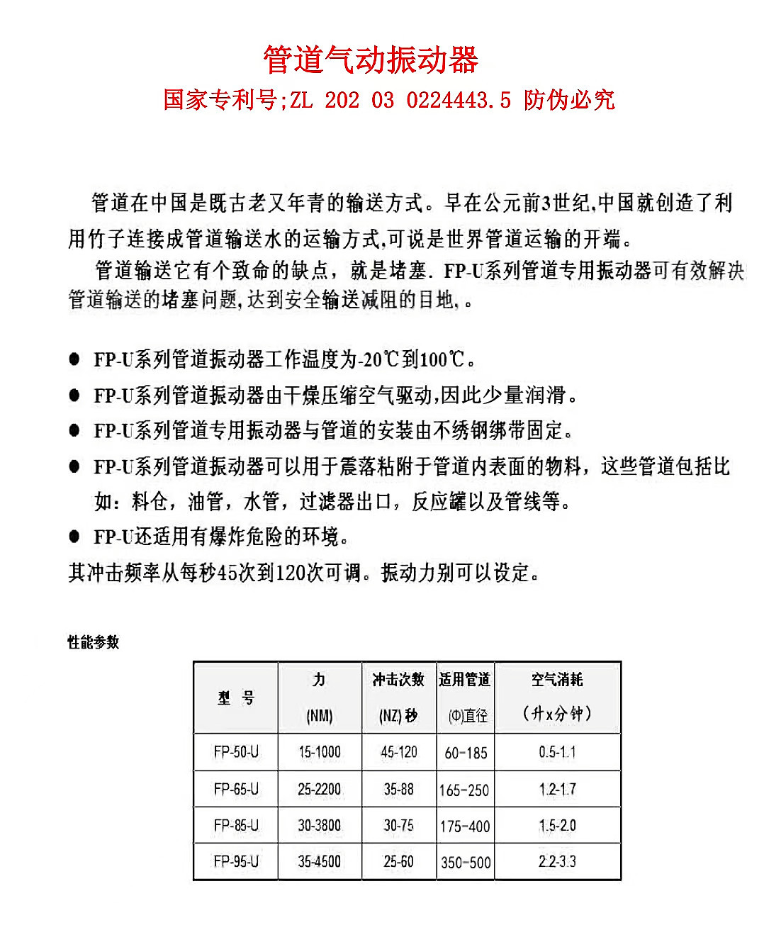 產品名稱:管道振動器FP-50-U FP-65-U FP-85-U FP-95-U管道專用振動器 產品說明: 管道專用氣動振動器 FP-50-U/FP-65-U/FP-85U/FP-95-U/ 可任意角度安裝 產品配有不銹鋼卡箍 安裝方便 振力可調 適用于任何管路